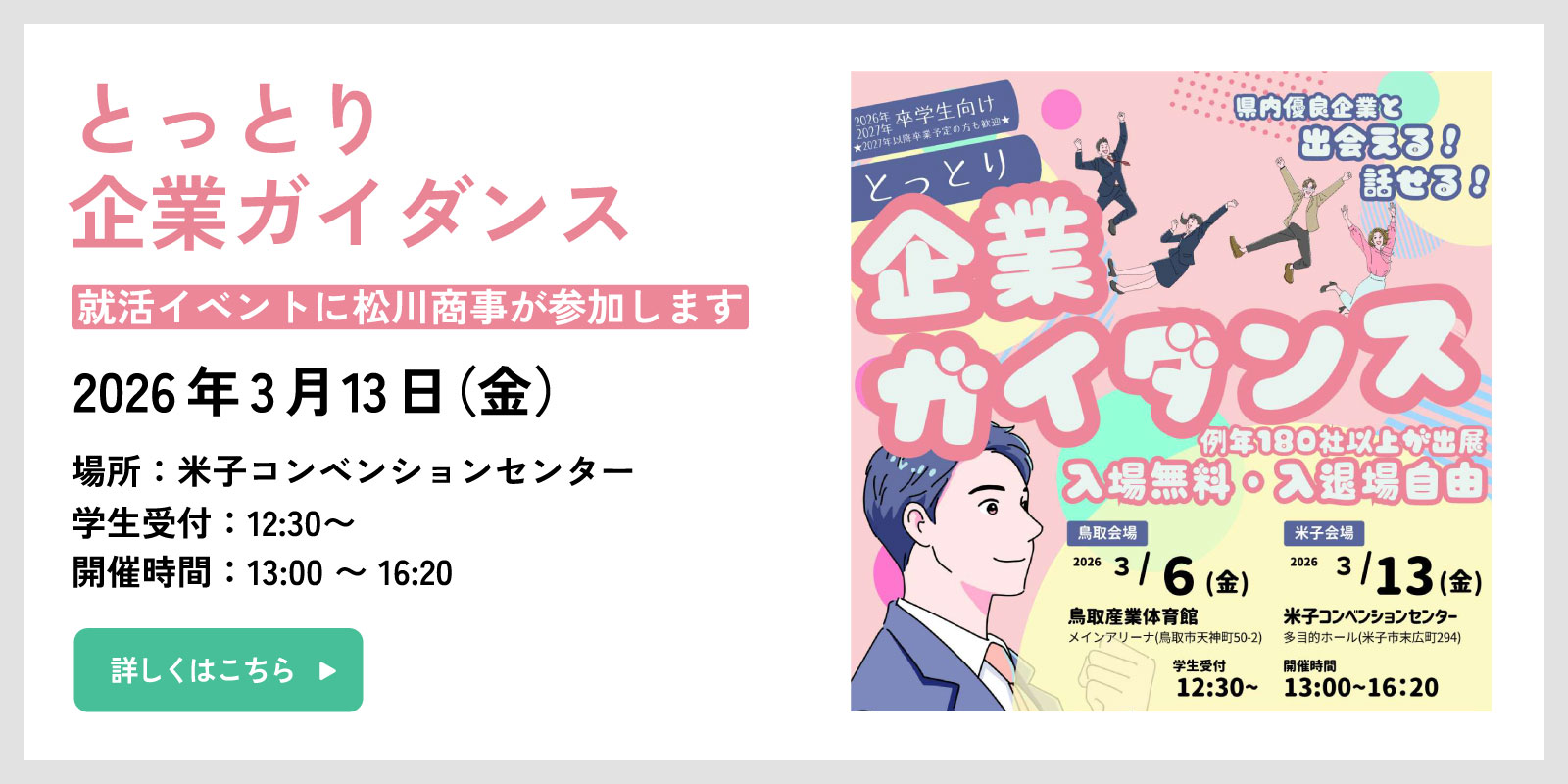 2026年3月14日に出雲地区企業説明会が開催されます。 松川商事も参加いたします。 ご興味のある方はぜひご参加ください。